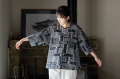 このシャツに使われている生地は、岩手県一関市の京屋染物店で一枚一枚染色しています。手捺染ならではの、かすれや揺らぎ、わずかな個体差もこの布の魅力のひとつ。