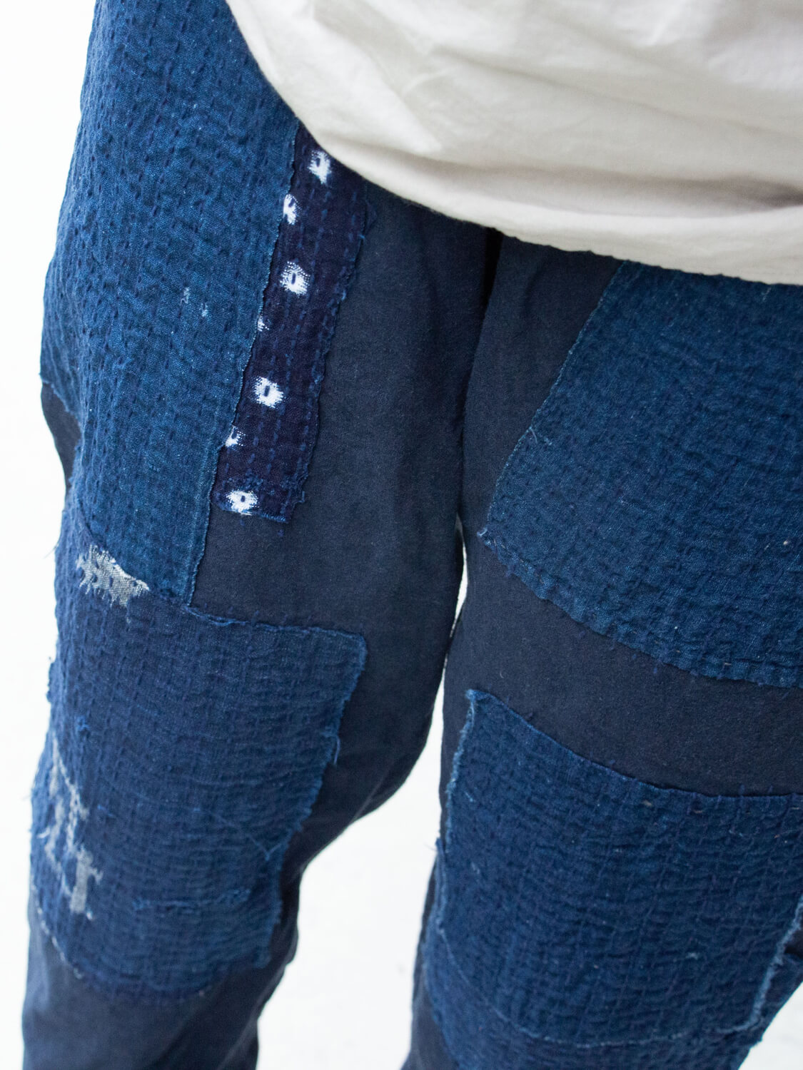 東北に古くから伝わる野良着「猿袴」はその名の通り、猿のように軽快に野山を動くことができる袴です。自然と共に農的な生活を営んできた東北で、山仕事や農作業の作業着として、またモンペのように部屋着としても愛用されてきました。猿袴の特徴はお尻に適度な生地のゆとりがあることや、ふくらはぎから足首にかけて細く作られていること。それらは山での動きやすさや、足運びをよくするために考えられた形です。