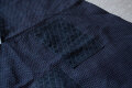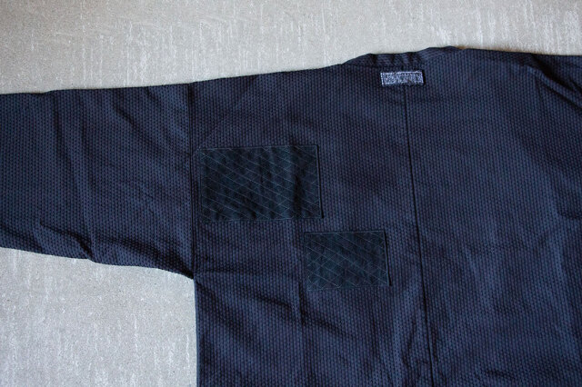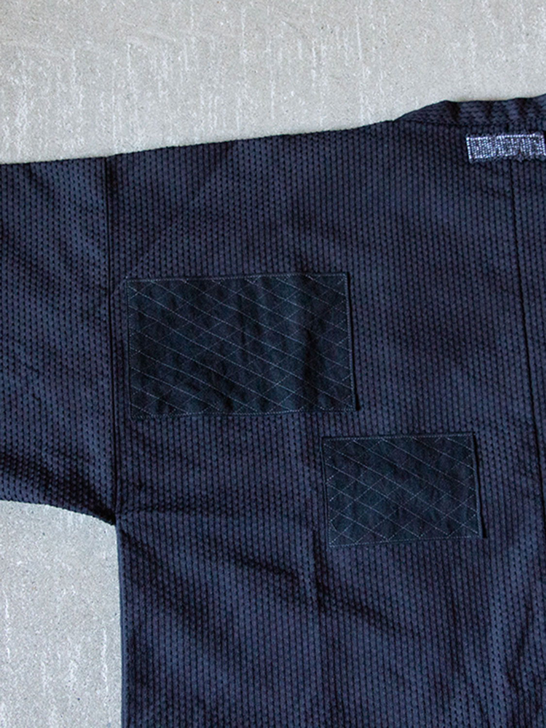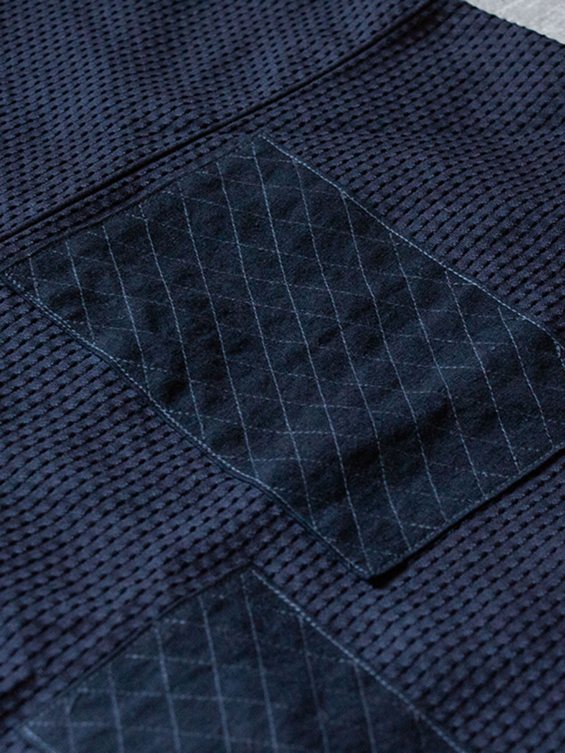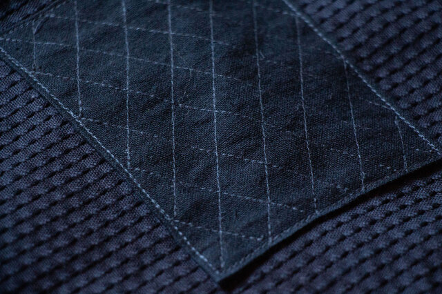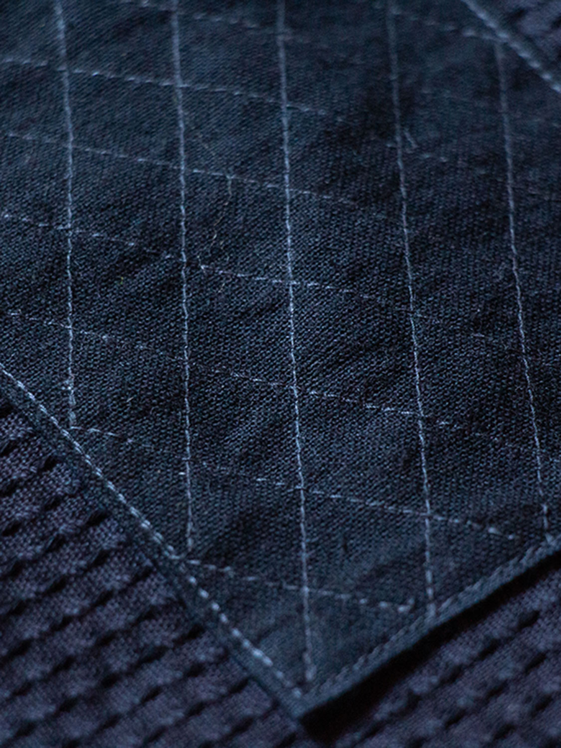 刺子生地は、その昔、火消したちが消防服として着用していた絆纏に使われていたほど丈夫な生地です。縁日のHANTENでも、永くご着用いただくことを考え、この刺子生地を採用しています。中厚手の生地に太めの黒糸が織り込まれた一本刺子生地は、丈夫でありながらも硬すぎない風合い。 凹凸感のある印象的な生地が特徴です。