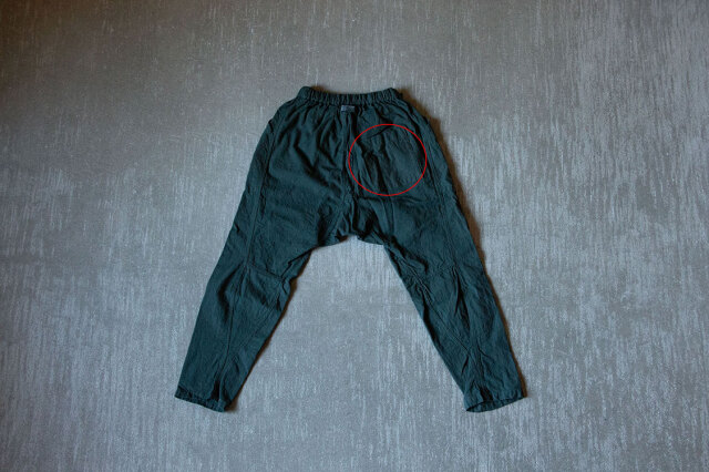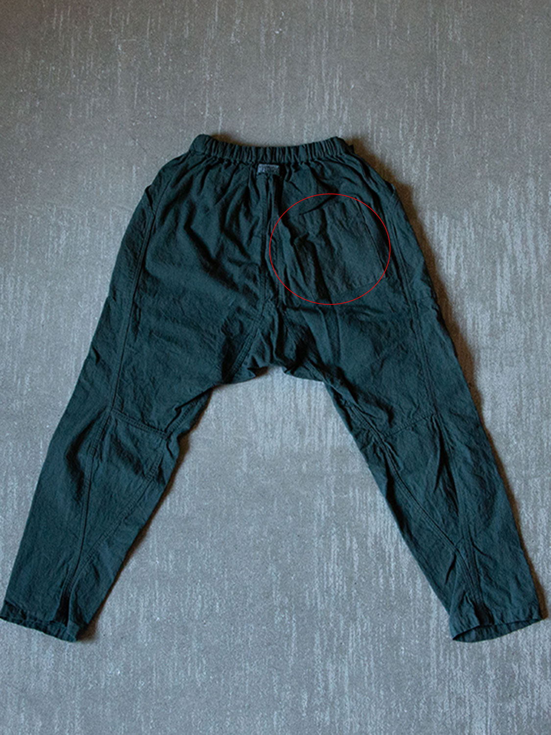 SAPPAKAMAはゆとりのある腰回りから太ももにかけてのシェイプと、キュッとしまったひざ下が特徴的です。サルエルパンツのように、お尻の部分に生地のゆとりを持たせることにより、足の可動域を妨げず、より動きやすい形を作っています。また後ろからのシルエットが悪くならないよう何度も試作を重ね、動きやすさもシルエットもちょうど良い、今の形に辿り着きました。