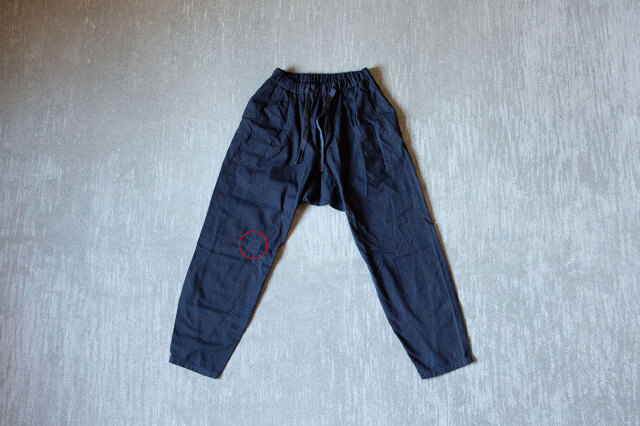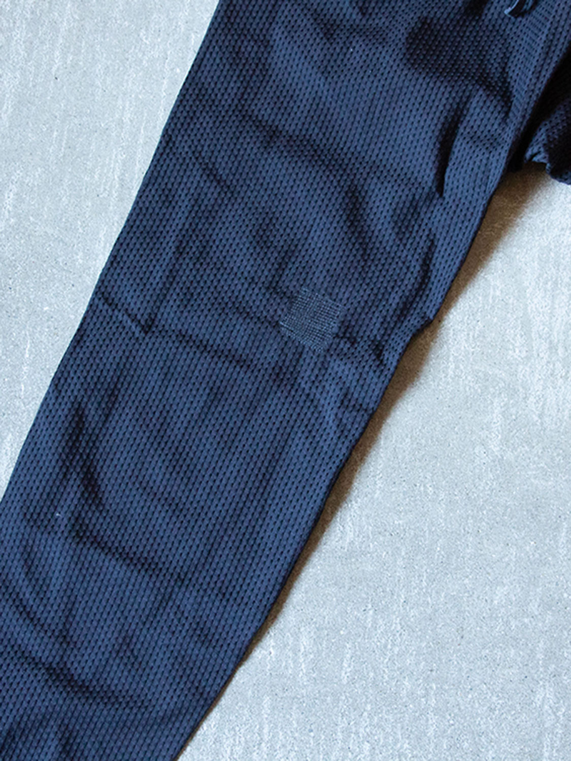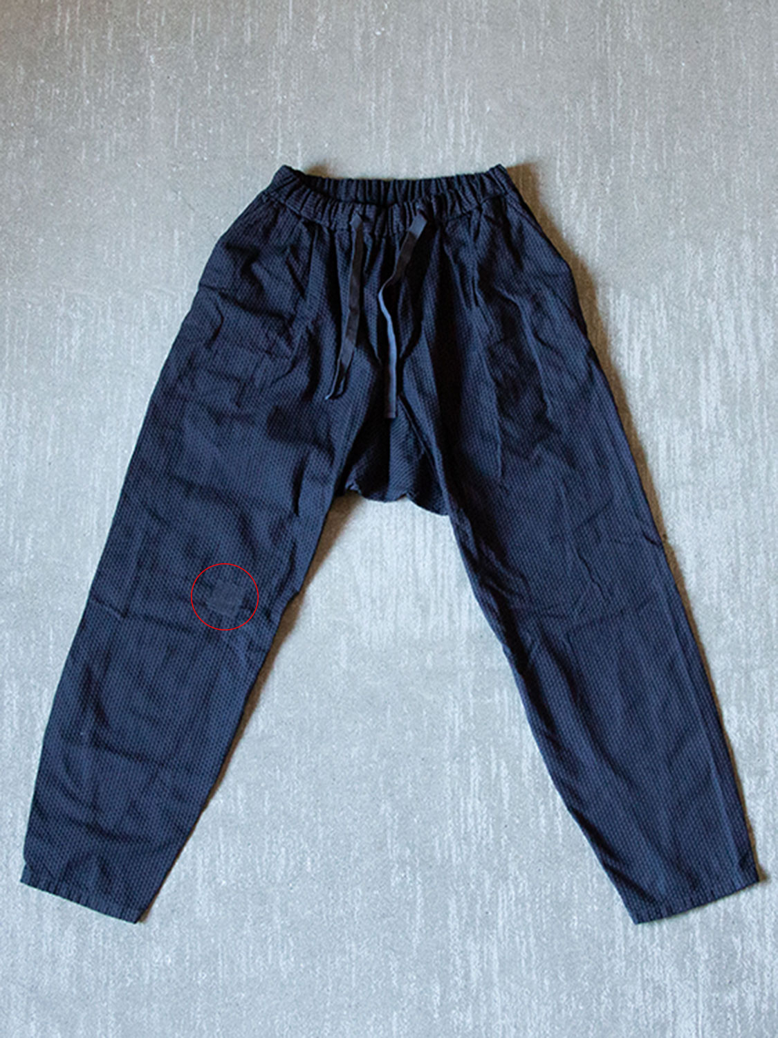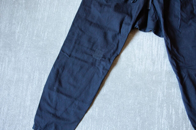 股下部分や、ふくらはぎ、普通のパンツにはない切り替えがあるのは、からだの形や動きに合わせて生地を当てているため。