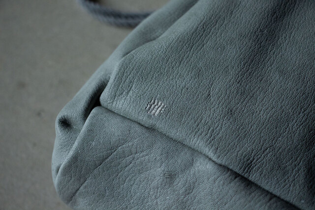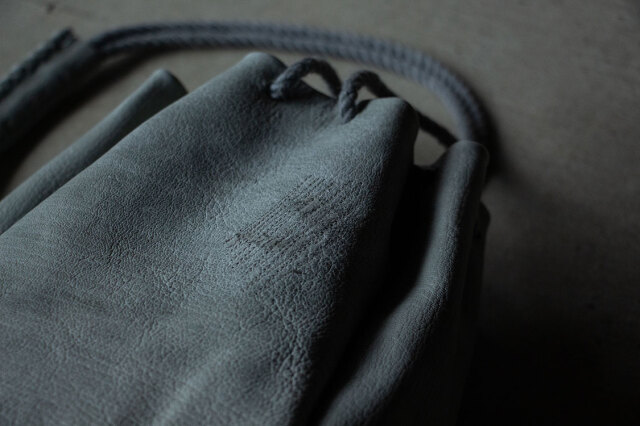 持ち手は、鹿革に手縫いの飾り縫いを施し、その凹凸が滑り止めになり、快適に持ち歩くことができます。紐は綿麻素材を使用し、長さ調節が可能です。