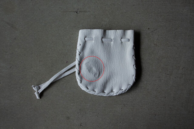 巾着の周囲は、鹿革で作った革紐の飾縫いを手縫いで仕上げています。