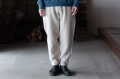 しっかりと重さがある生地なので自重に耐えられるようにベルトループが付いていますが、ウエストゴムと内側のオーガニックコットンの紐で、ベルトを用いなくても着用が可能です。比較的強めのテーパードが入っていて、生地厚の割にはスッキリとしたシルエットとなっています。