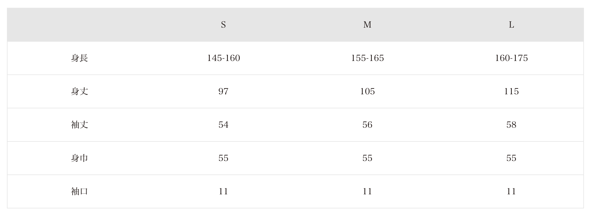 身丈は、S:97㎝、M:105㎝、L:115㎝です。
