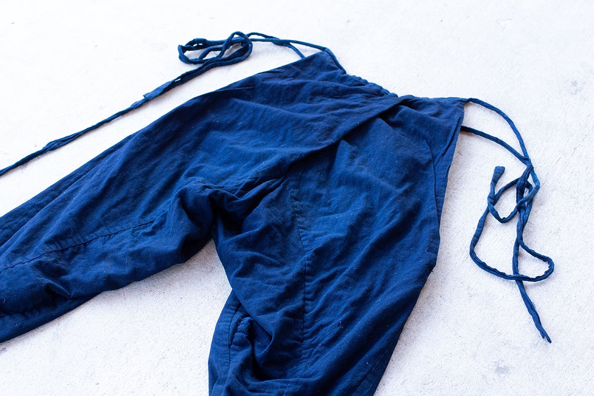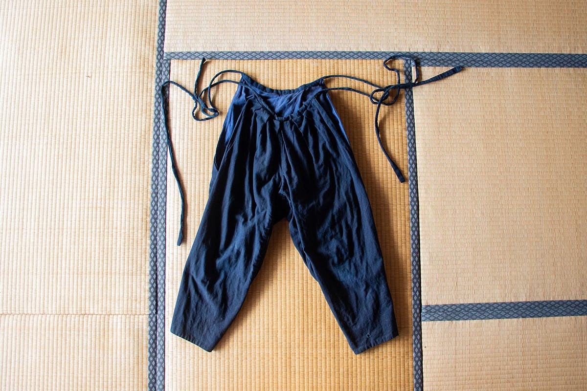 従来のマタギもんぺは、袴のように前と後に分かれた生地を紐で縛り履きますが、今の暮らしではかなり履きにくい仕様です。