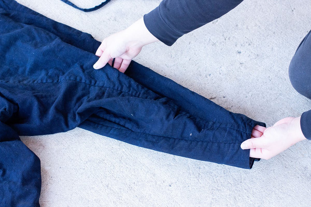 膝下のシェイプは従来のマタギもんぺよりも細めに仕上げました。