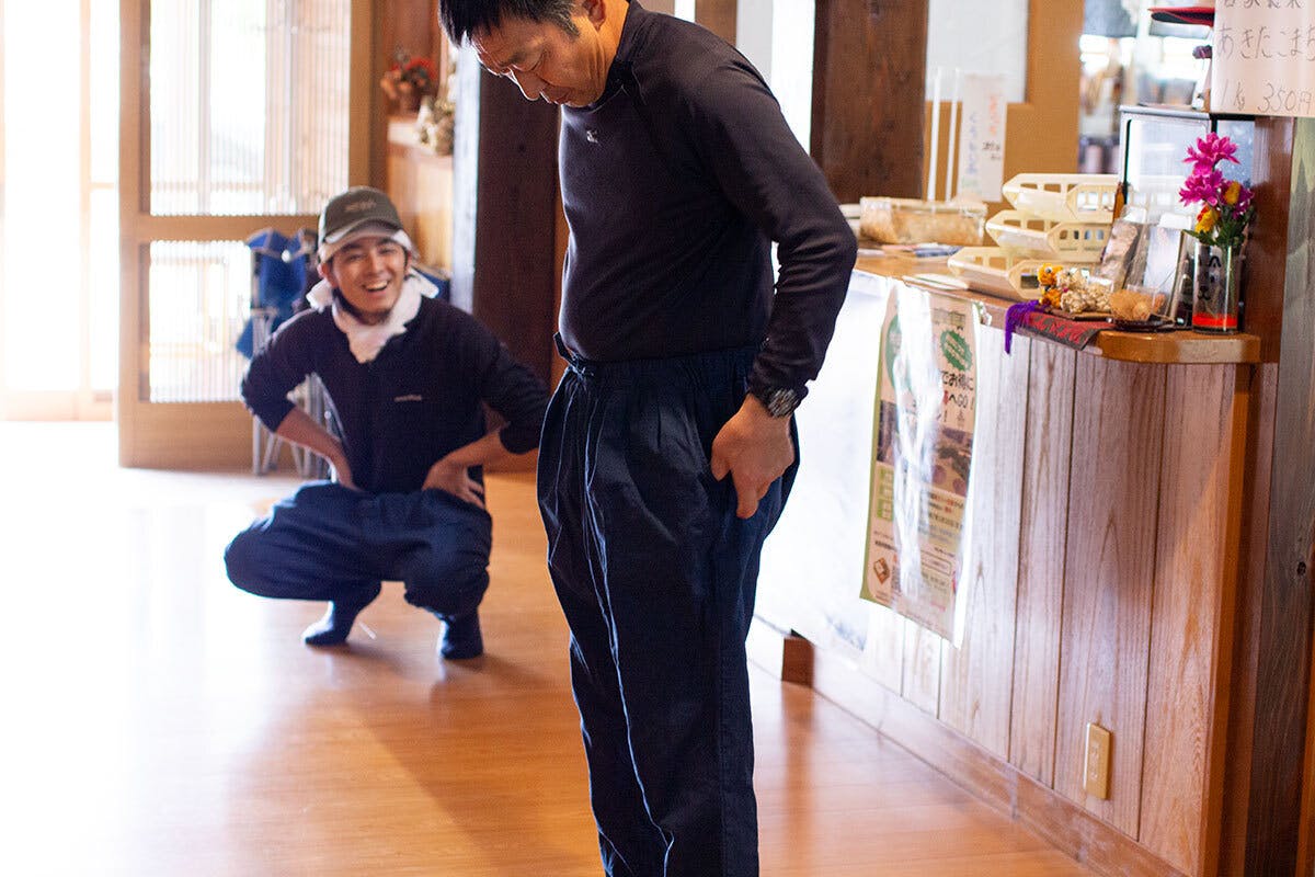 松橋旅館に保管していたマタギもんぺが、まさか現代に蘇るなんて思ってもみなかったです。実際に出来上がったマタギもんぺを履いてみて、太もも周りにゆとりがあってとても動きやすく、足先の方がスッキリしているので山でも邪魔にならずとても良い仕上がりです。要望していた生地の乾きも良好で、釣りでも使えるのが嬉しいですね。