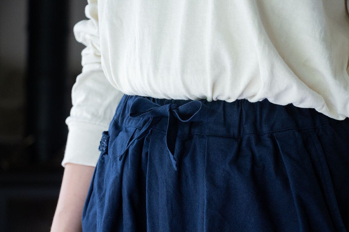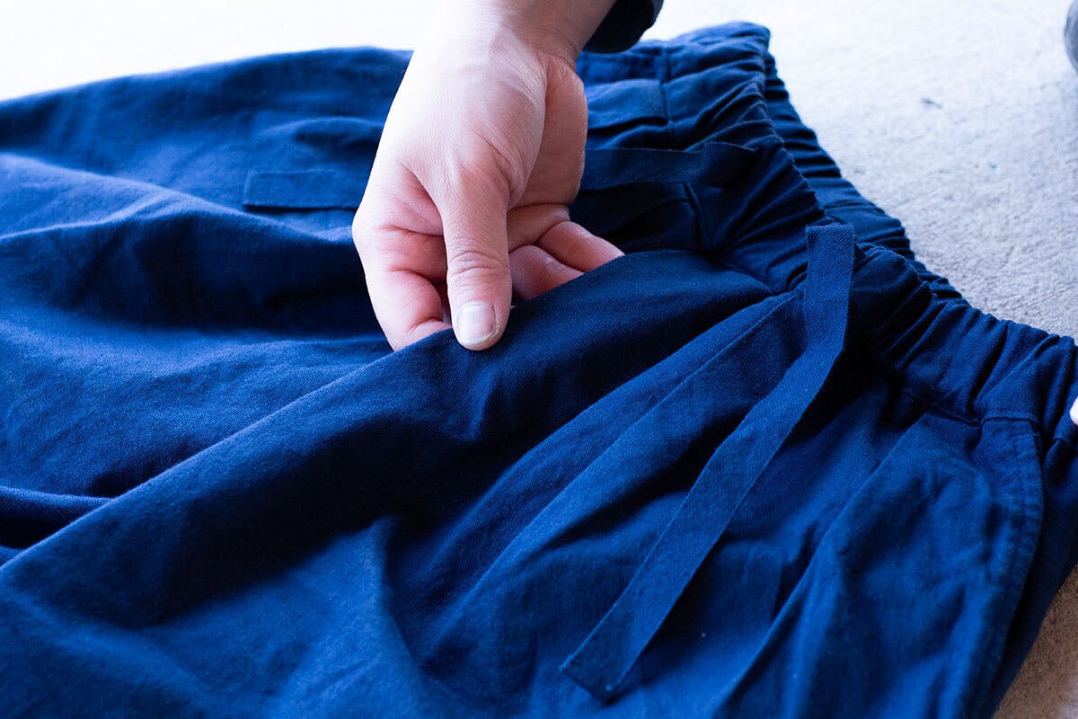 簡単に着脱できるように、ウエストにはゴムを入れ、紐で調整できる仕様にしました。