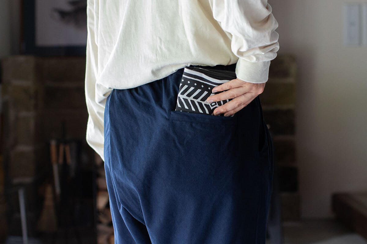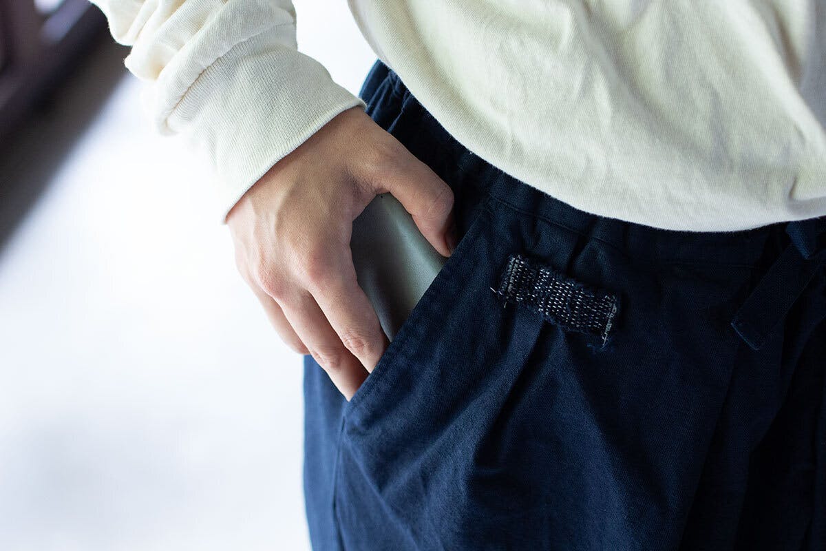 従来のマタギもんぺにポケットはありませんが、今の暮らしではスマホやハンカチ・手ぬぐいなどを持ち歩くために、ポケットは必須です。