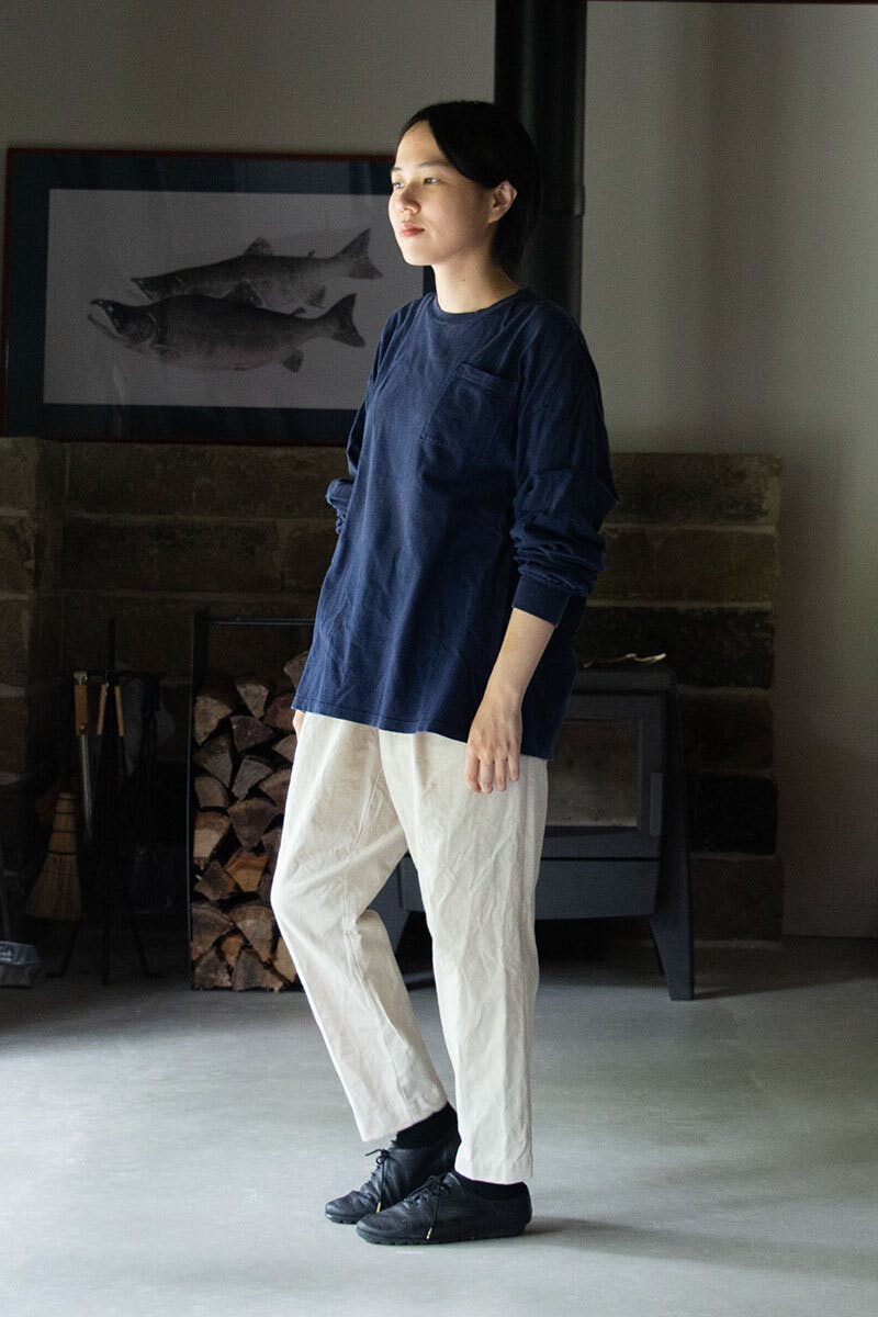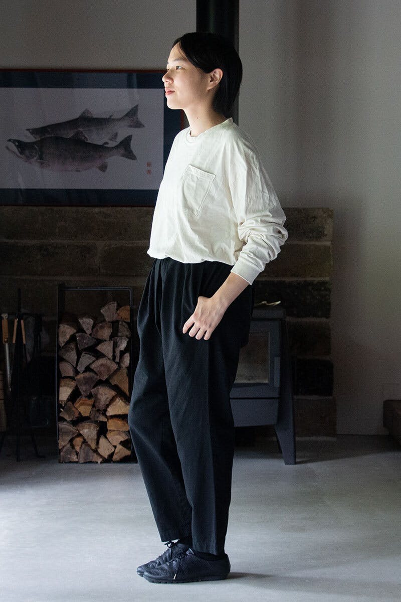 もんぺに足を通してみて気が付いたのは、昔からのマタギの知恵から生まれたこのもんぺの形は、現代においてもとても着こなしやすいということです。山や田畑に出かける野良仕事はもちろんのこと、デスクワークや、私のように普段から長時間座ったり立ったりの作業を繰り返す業種にとって、股関節周りの軽さや動きやすさはとても重要です。かつて、人が決してコントロールできないような、自然との深い繋がりのあったマタギの里で生まれたこの一着。当時は行動着としても、手仕事着としても活躍していました。それは対人ばかりが活動範囲ではない現代の私たちにとっても、着こなしやすい機能やスタイルを兼ね備えているように感じられました。