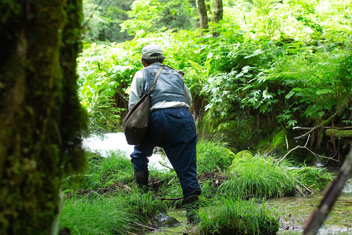 この「マタギもんぺ」は、かつての服を単純にリバイバルしたものではなく、チームメンバーが当時を知るマタギの人々と出会い、その服と人が生きた山を彼らと共に歩き、フィールドワークを重ねたことで生み出された一着です。