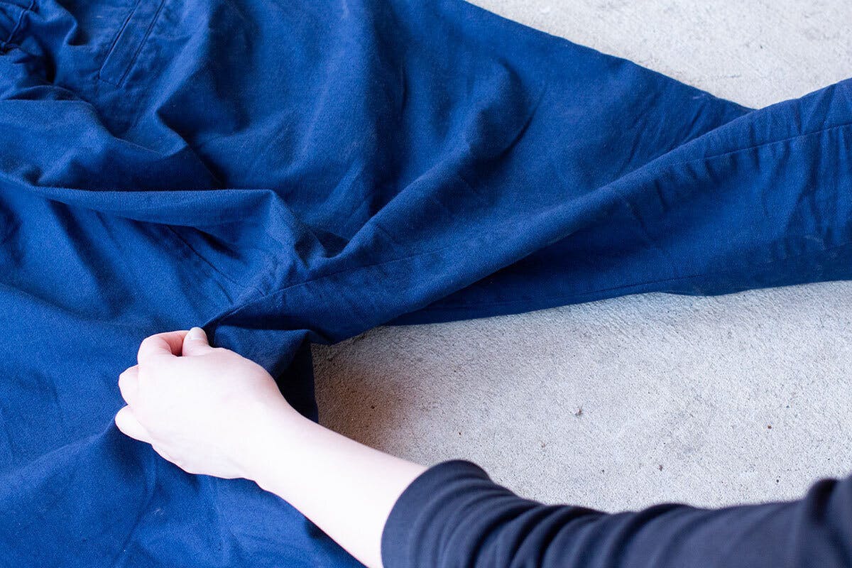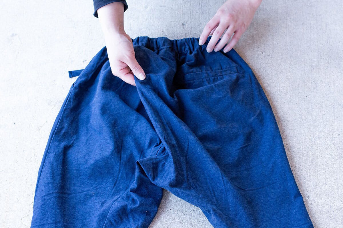 マタギもんぺの最大の特徴の一つ『お尻の大きなタック』は、生地のゆとりを作り、動いたときに生地が突っ張らず可動域を邪魔しない作りになっています。